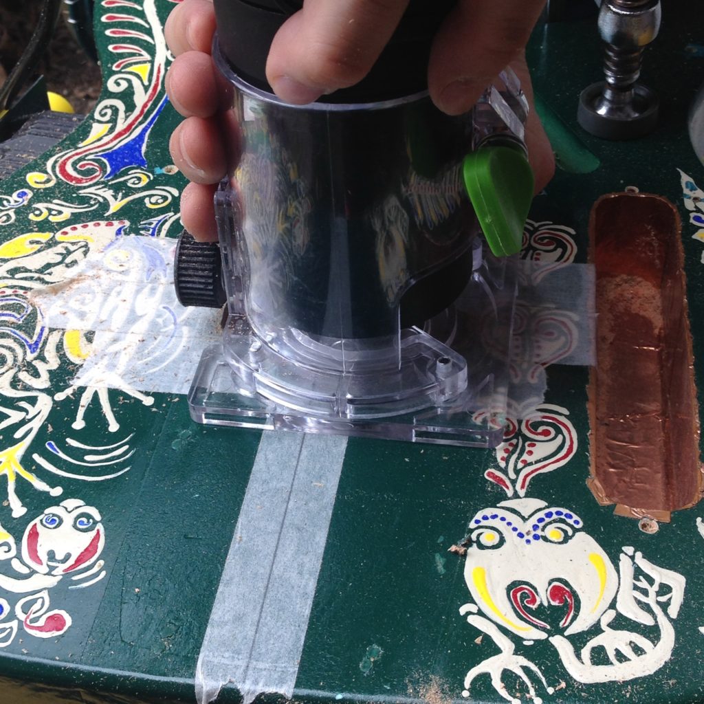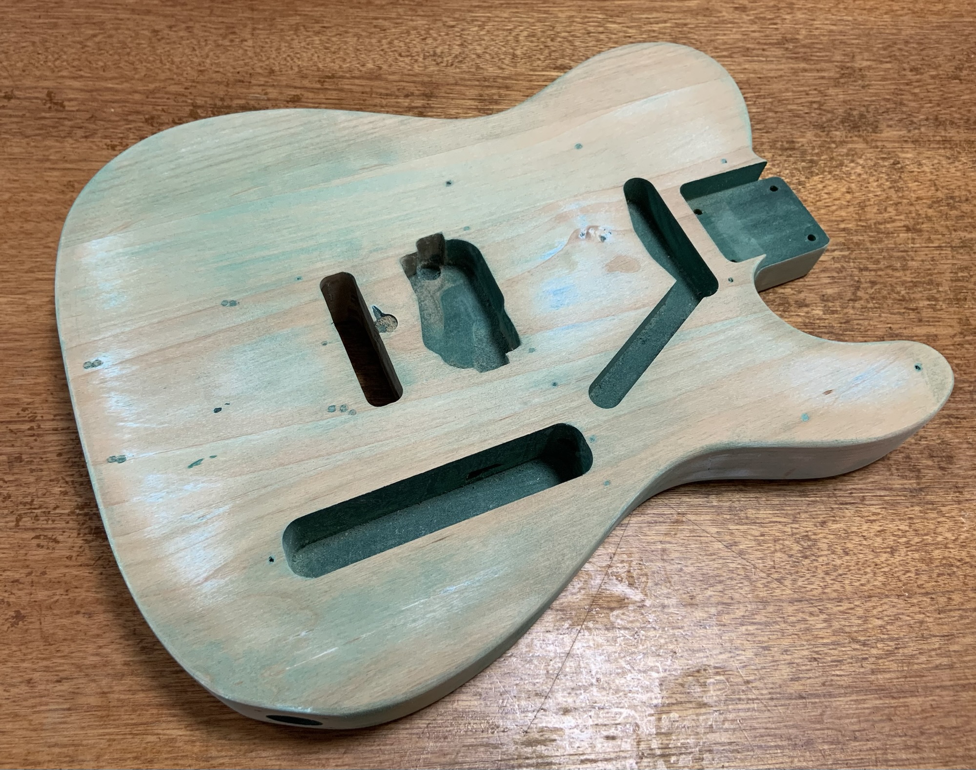 なぜなら別で進めていたテレマスタータイプのギターにシンクロナイズドトレモロを搭載するためにボディのザグリを入れる必要があり、練習台としてこの緑のボディが抜擢されていました。