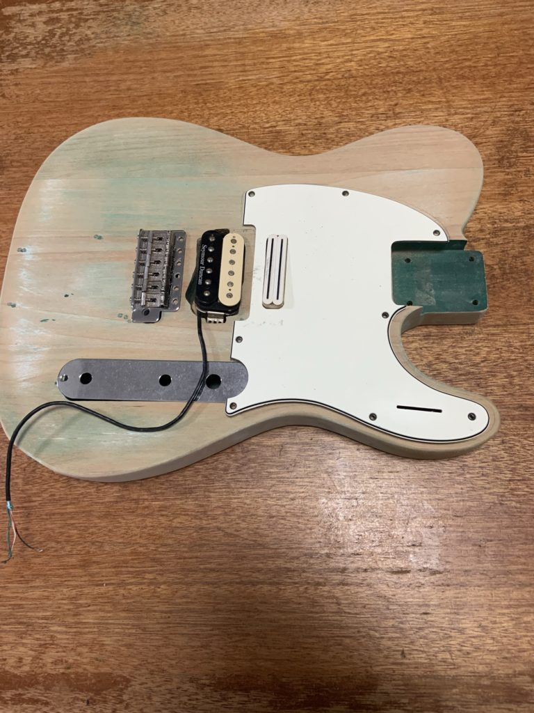 ピックアップはこれまた余ってて勿体無いダンガンのハムバッカー×2。フロントにはPUなし、センターとブリッジにPUを設置。イメージ的にはGOGO7188のユウが使ってたテレキャスを真似た感じのレイアウト。